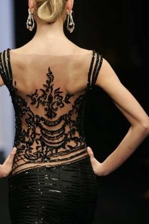 I just found this gorgeous open-backed Chanel gown on Pinterest, and just had to post. It looks like an intricately beaded tattoo across your back. This dress commands attention! Only Chanel. Love it.