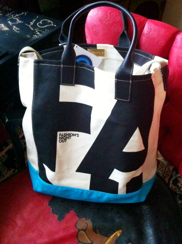 I just received my Fashion’s Night Out tote bag from QVC {Ordered it on Thursday}, who powered the fashionsnightout.com website for last week’s event.  I must say I am surprised that the quality is as good as it is {which it should be for $50!}.