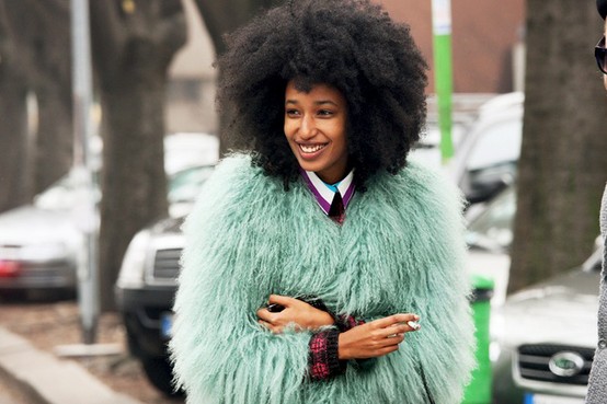 I’m not sure what I love more, her funky afro or her mint coloured Mongolian fur jacket!