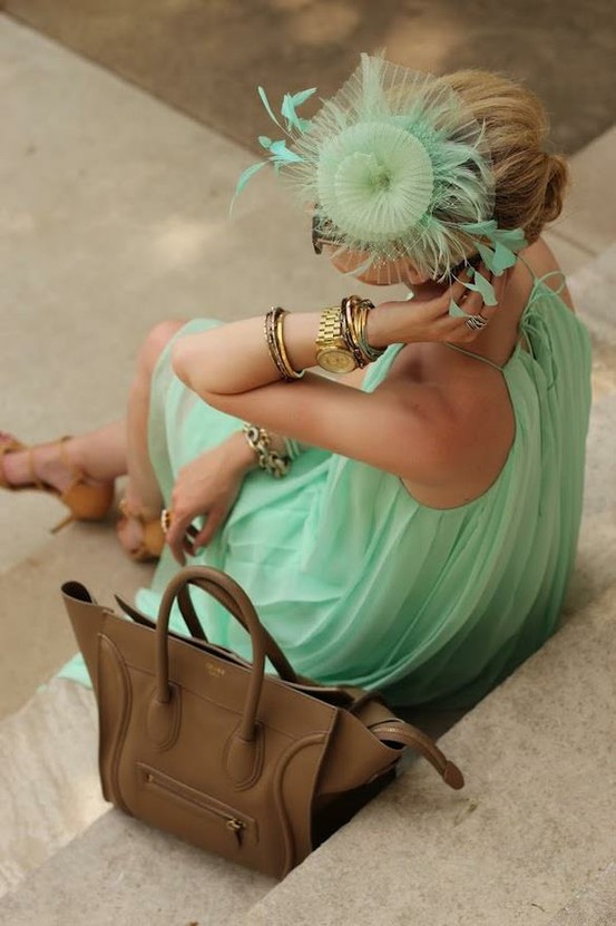 Mint Fascinator and mint pleated dress, paired with a gorgeous olive Celine Trapeze bag (oh how I want that bag!) is a beautiful combination.