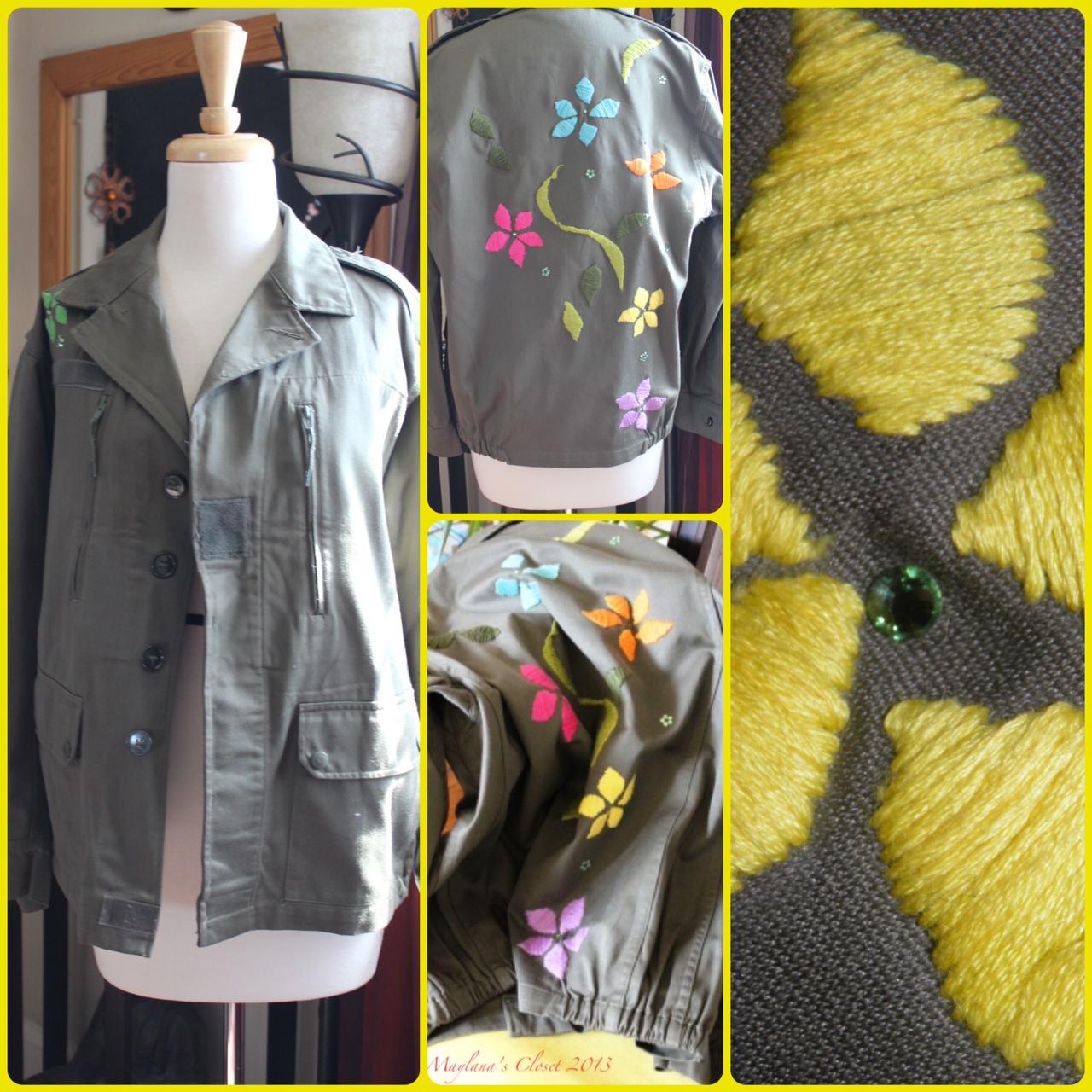 One of the projects I finally completed, was to list this gorgeous hand embroidered military jacket, painstakingly hand sewn by the wonderful Ms. Althea Anderson in London. You may remember Ms. Anderson, who wrote the wonderful guest blog post: “A Floetic Night With Floetry” click here to read her superb account of what must have been a beautiful and enchanting night. As you can see, she is a woman with many talents!