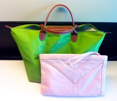 Update 4/11:  It’s seems everyone is in love with my green Longchamp bag, which has overshadowed the pink clutch.  Thanks to everyone who complimented it. Unfortunately this colour came out about 3 years ago, therefore it is no longer available.  Longchamp always creates an extra special colour each season.  The colour I love right now is the orange, which will be a lovely pop of colour for the summer.  See collection here:   http://www.longchamp.com/en/le-pliage-women-255.html